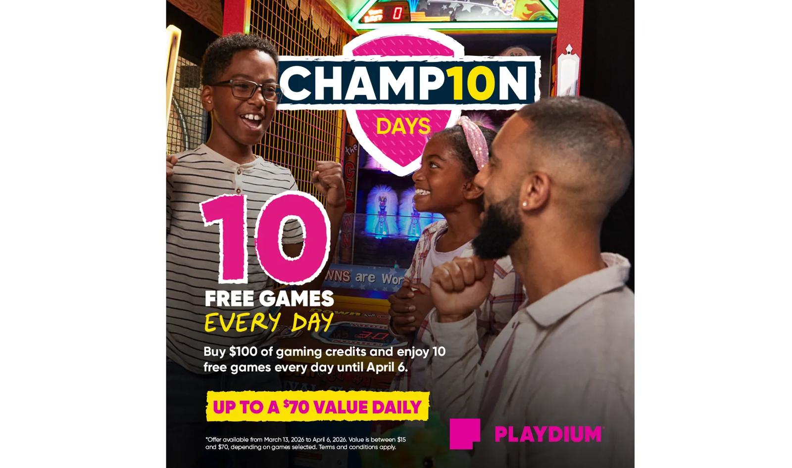 🕹️🤩🕹️Don’t take a March break from winning! CHAMP10N DAYS mean 10 FREE GAMES every day until April 6, when you buy $100 of gaming credits.